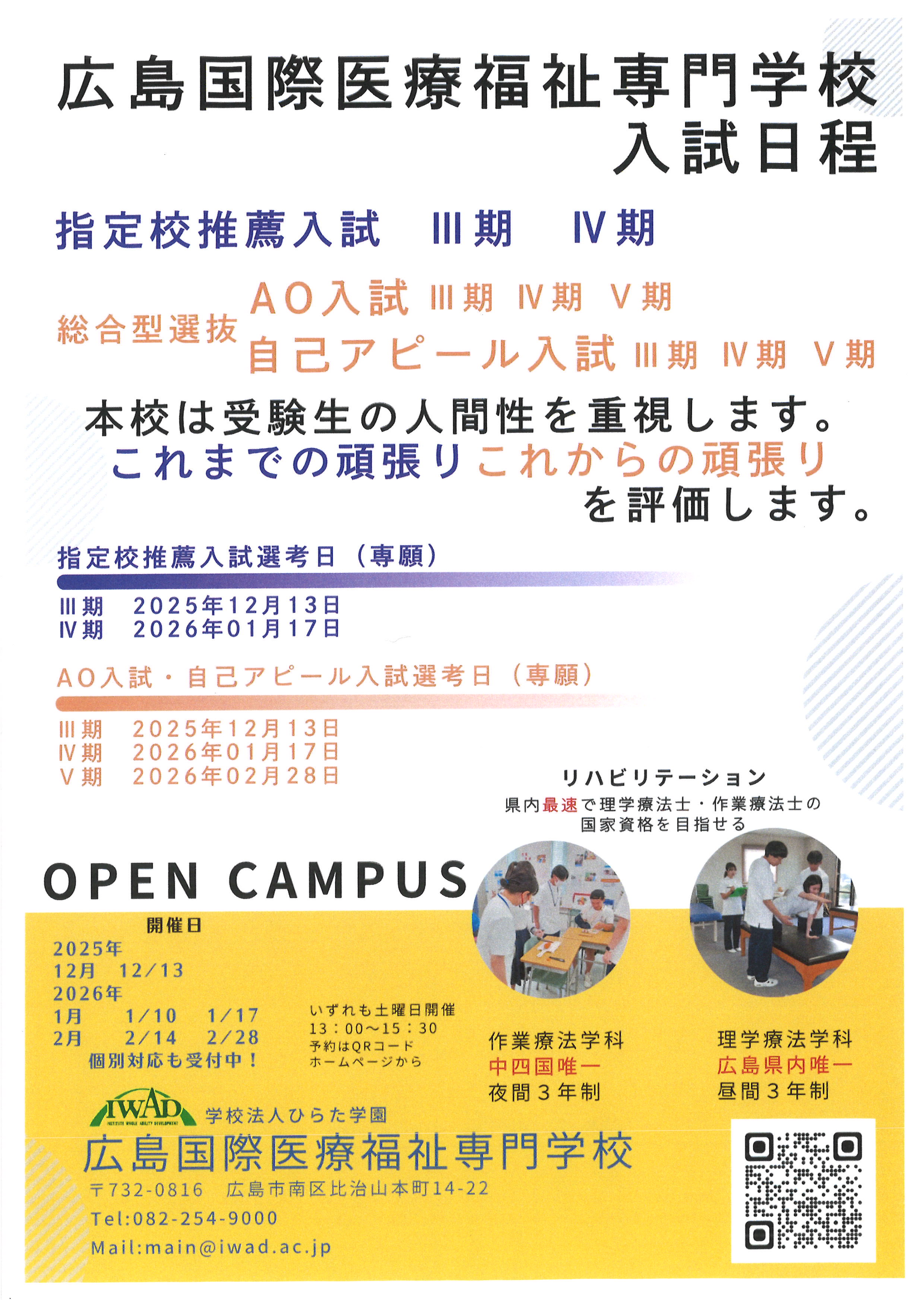 学校法人ひらた学園広島国際医療福祉専門学校 HIROSHIMA INTERNATIONAL AND MEDICAL WELFARE COLLEGE(旧校名:IWAD環境福祉リハビリ専門学校)