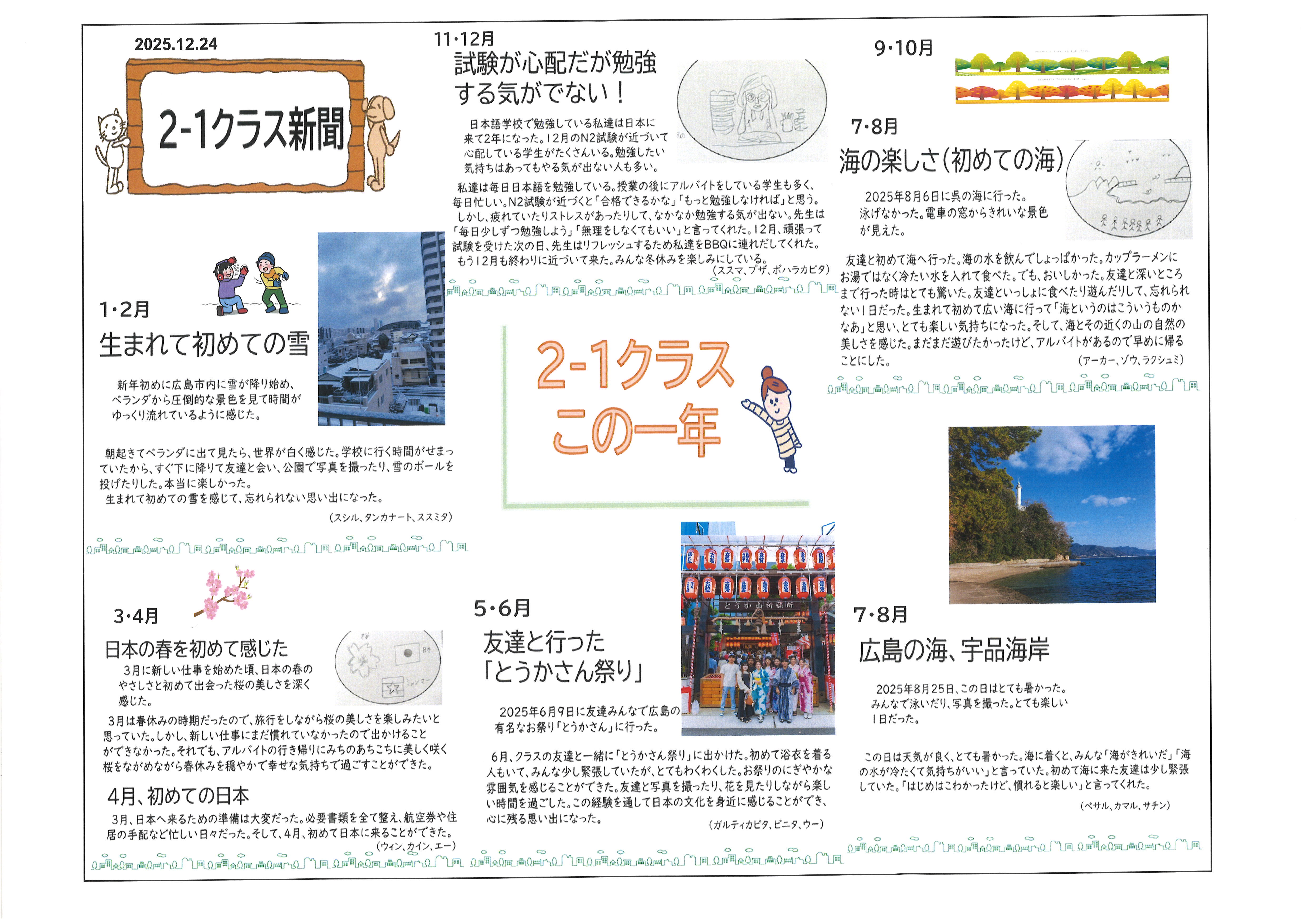 今回の新聞では2-1クラスの留学生が広島での生活で日本の文化を学び、感じている様子がご覧いただけます。